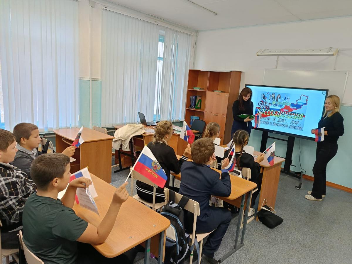 В этот день в сельских домах культуры, клубах и библиотеках Рубцовского района прошли акции, встречи с участниками СВО, информационные часы, уроки-путешествия, интеллектуальные игры, просмотры документальных фильмов, в ходе которых участники ознакомились с историческими событиями и предпосылками воссоединения Донбасса и Новороссии с Россией.