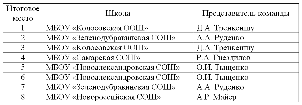 В соревнованиях приняли участие 5 общеобразовательных учреждений, три из них представили по 2 команды. Итоговые места распределились следующим образом: