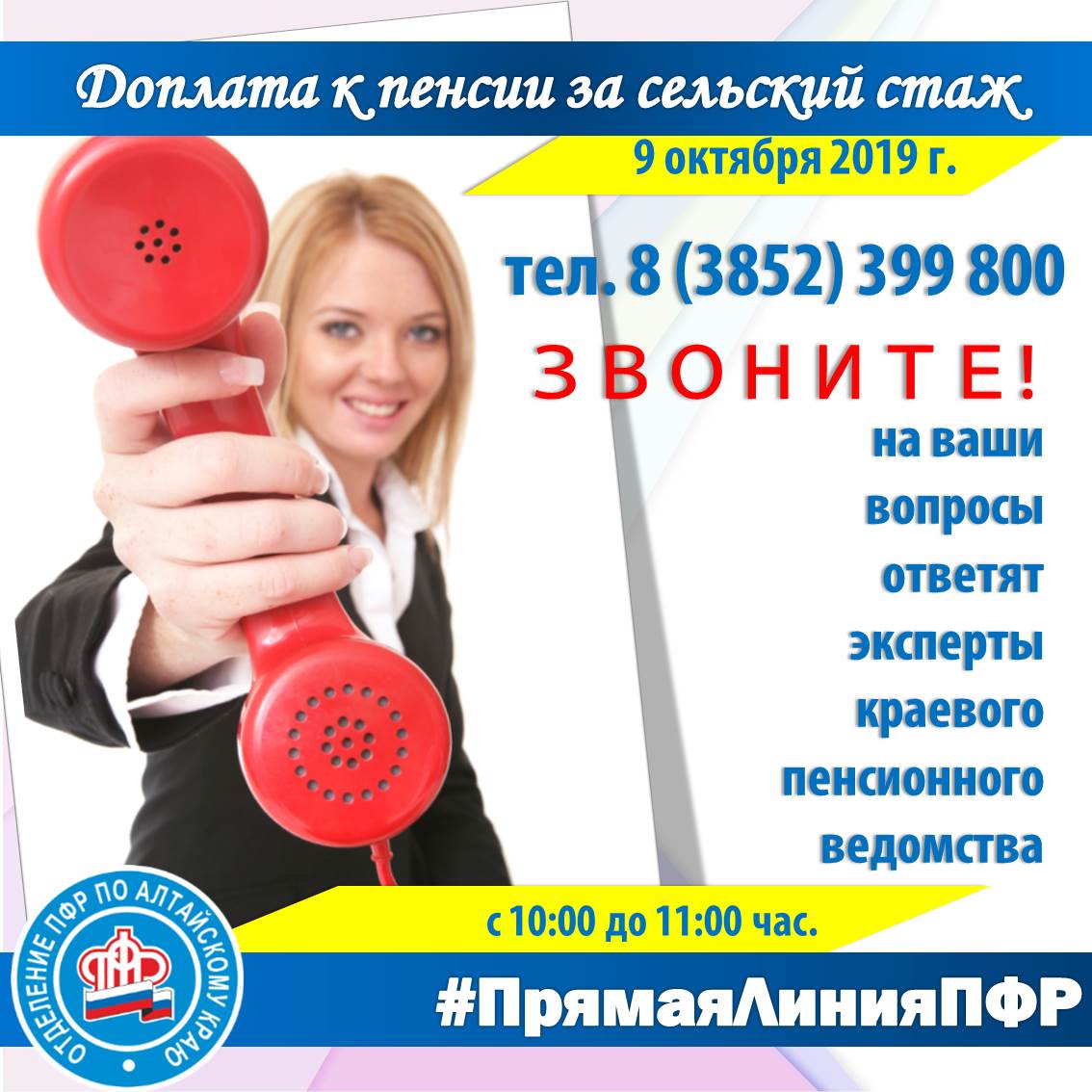 В следующую среду, 9 октября, Отделение Пенсионного фонда РФ по Алтайскому краю проведёт «прямую телефонную линию» для жителей региона по теме дополнительной материальной поддержки жителей сельской местности. |