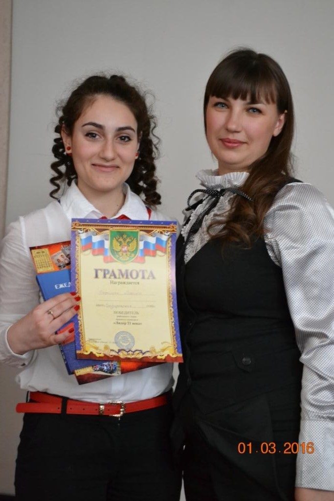 Подтверждением данного тезиса, стало известие о том, что ее ученица Саркисян Мариета, учащаяся 11 класса вместе с руководителем приглашены в Москву для участия во Всероссийском этапе конкурса «Лидер XXI века». Напомним, что Мариета стала победителем районного, а затем краевого этапов конкурса, а по итогам заочного конкурса вошла в число 18 претендентов которым выпала честь защищать свои регионы на Всероссийском уровне.