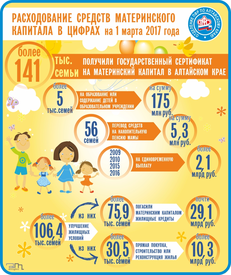 Закон о государственной поддержке семей с детьми с помощью средств материнского капитала действует в нашей стране уже одиннадцатый год. За это время заветные сертификаты получили свыше 141 тысячи алтайских семей, причем больше половины из них уже полностью использовали его средства. Только на погашение жилищных кредитов владельцы капитала направили более 29,1 млрд рублей. Нередко средства МСК жительницы региона инвестируют в образование ребенка. И в целом данная госпрограмма – одна из самых успешно реализующихся на Алтае.