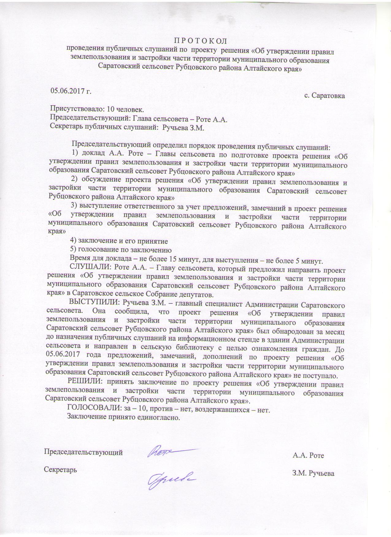 Протокол проведения публичных слушаний по проекту «Об утверждении правил землепользования и застройки части территории муниципального образования Саратовского сельсовета Рубцовского района Алтайского края»