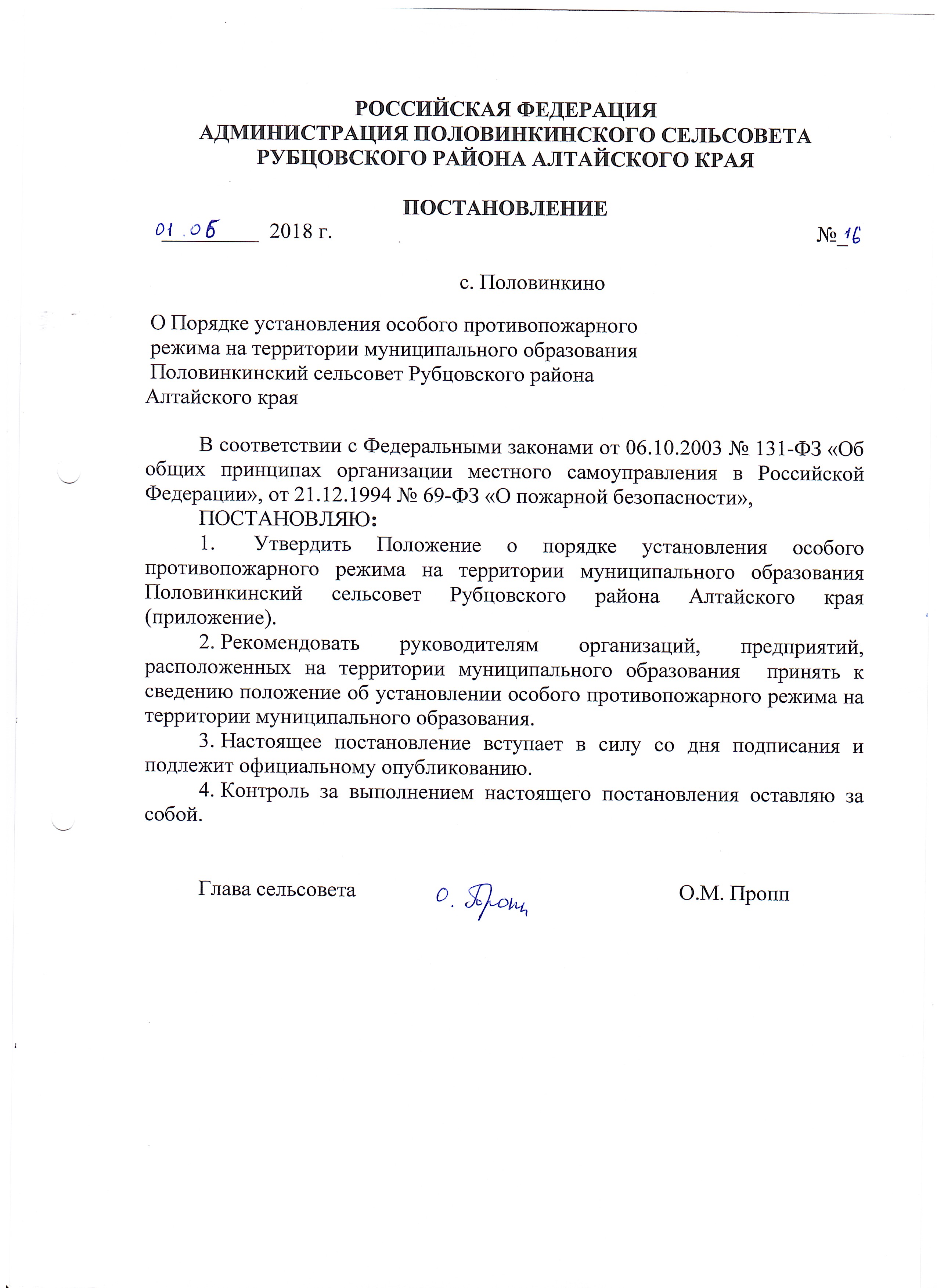 Постановление №16 от 01.06.2018 О Порядке установления особого противопожарного режима на территории муниципального образования Половинкинский сельсовет Рубцовского района Алтайского края
