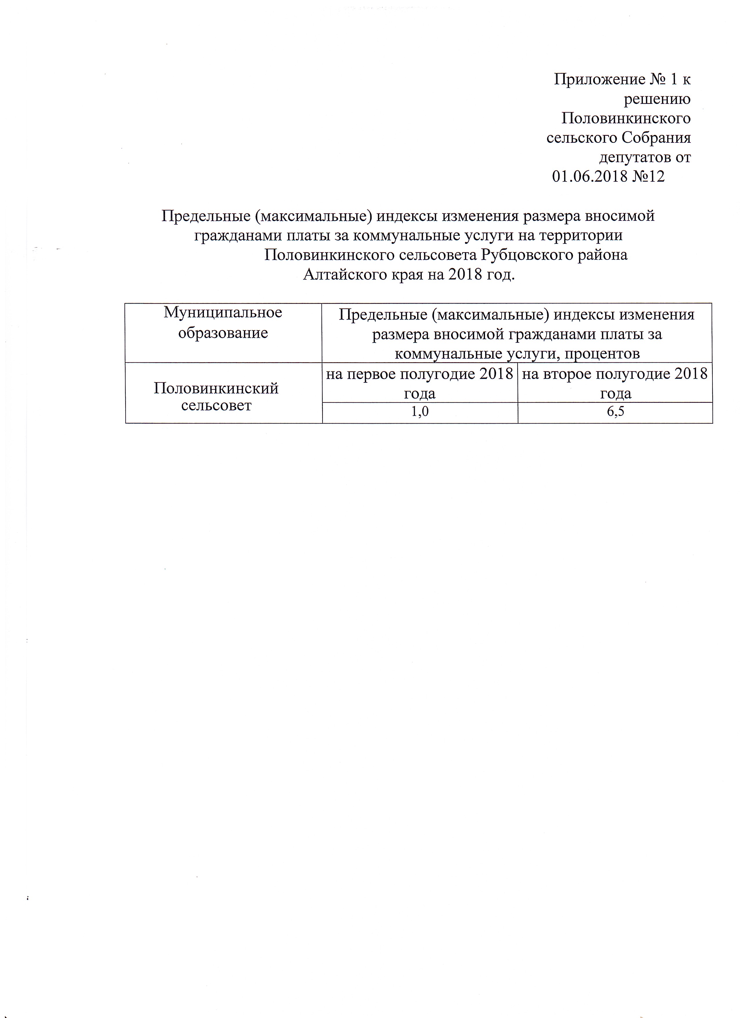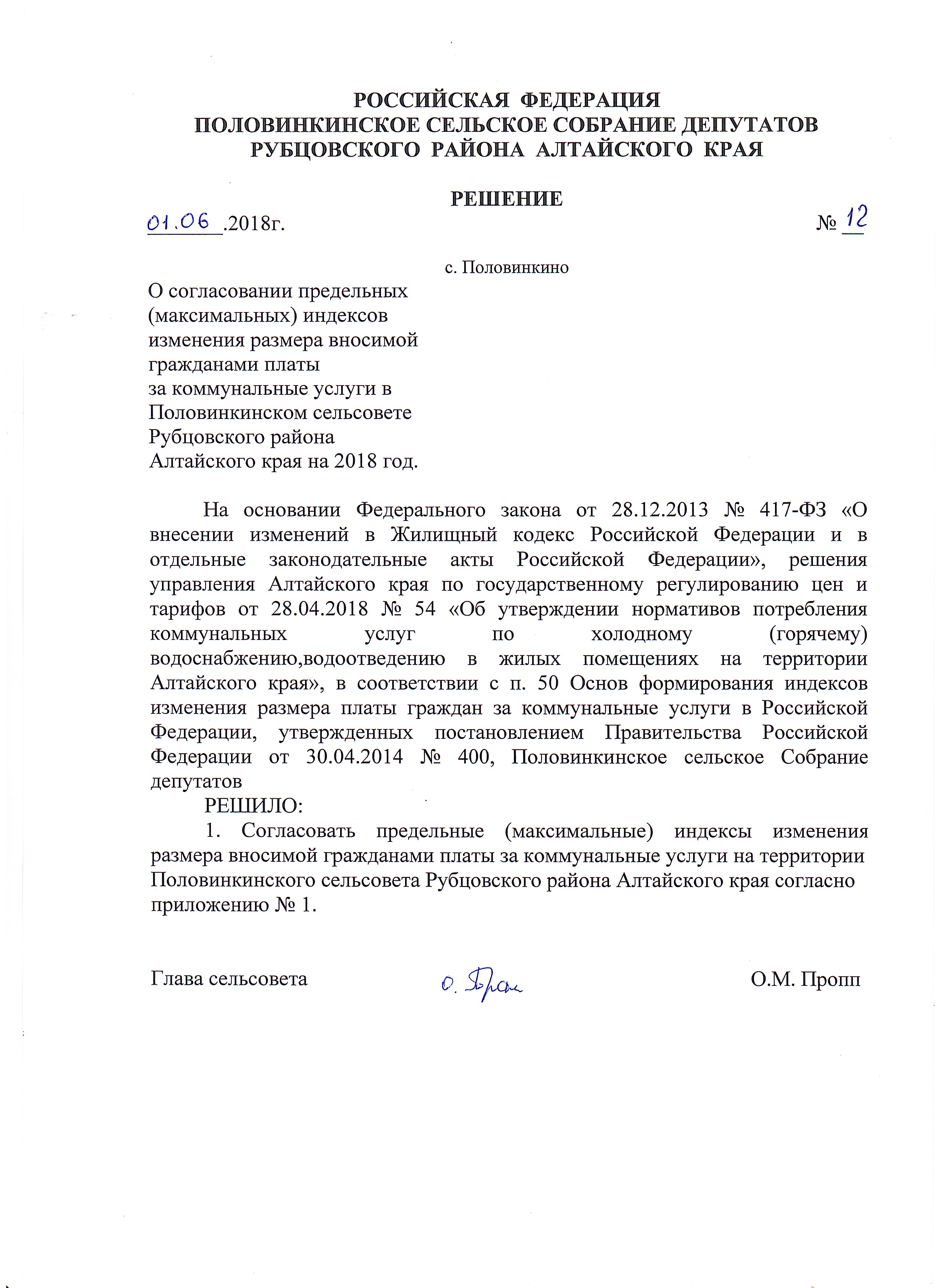 Решение ССД №12 от 01.06.2018 "О согласовании предельных (максимальных) индексов изменения размера вносимой гражданами платы за коммунальные услуги в Половинкинском сельсовете Рубцовского района Алтайского края на 2018 год."