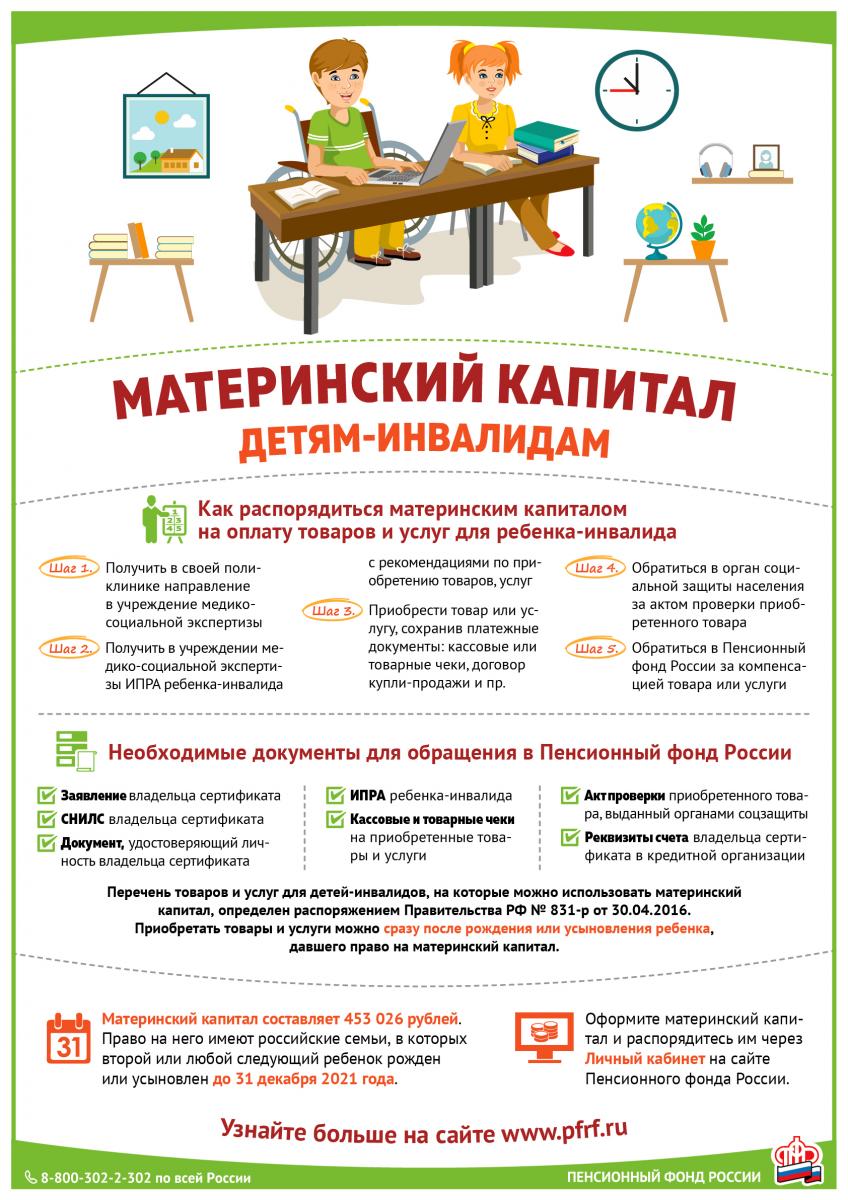 Более подробно о направлении средств материнского капитала на приобретение товаров и оплату услуг для социальной адаптации и интеграции в общество детей-инвалидов можно узнать в разделе «Жизненные ситуации».