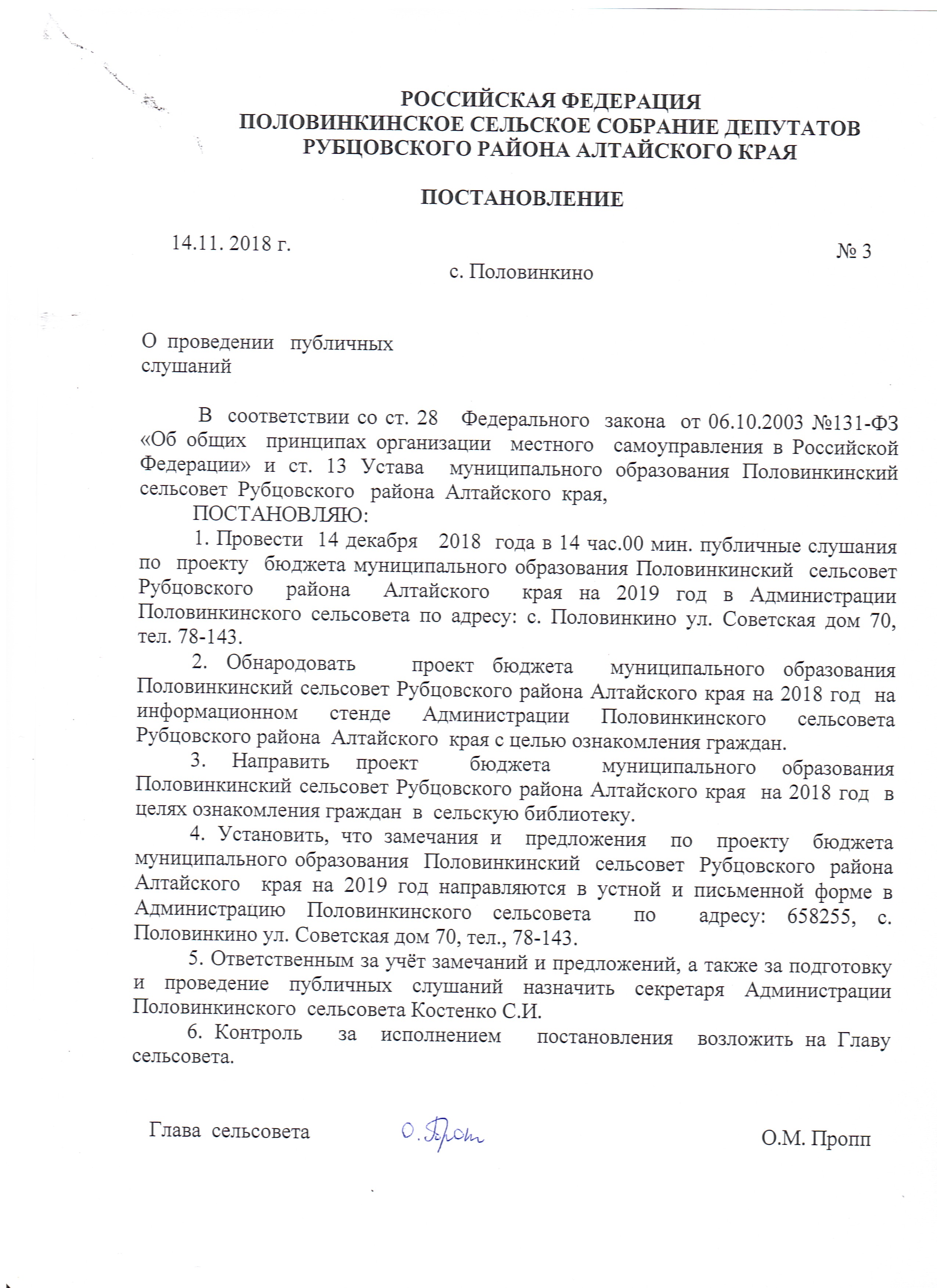 Постановление №3 от 14.11.2018 " О проведении публичных слушаний"