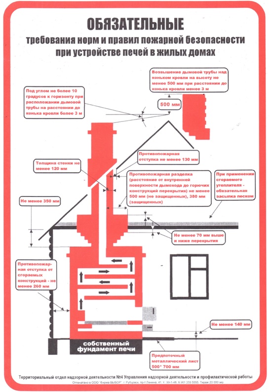 Строительные нормы и правила требуют, чтобы любая печь отвечала строгим противопожарным требованиям. Печь не должна примыкать плоскостью к деревянным (сгораемым) стенам или перегородкам. На чердаках все дымовые трубы и стены, в которых проходят дымовые каналы, должны быть побелены. На полу перед топкой необходимо прибивать предтопочный металлический лист размером 50х70 см.