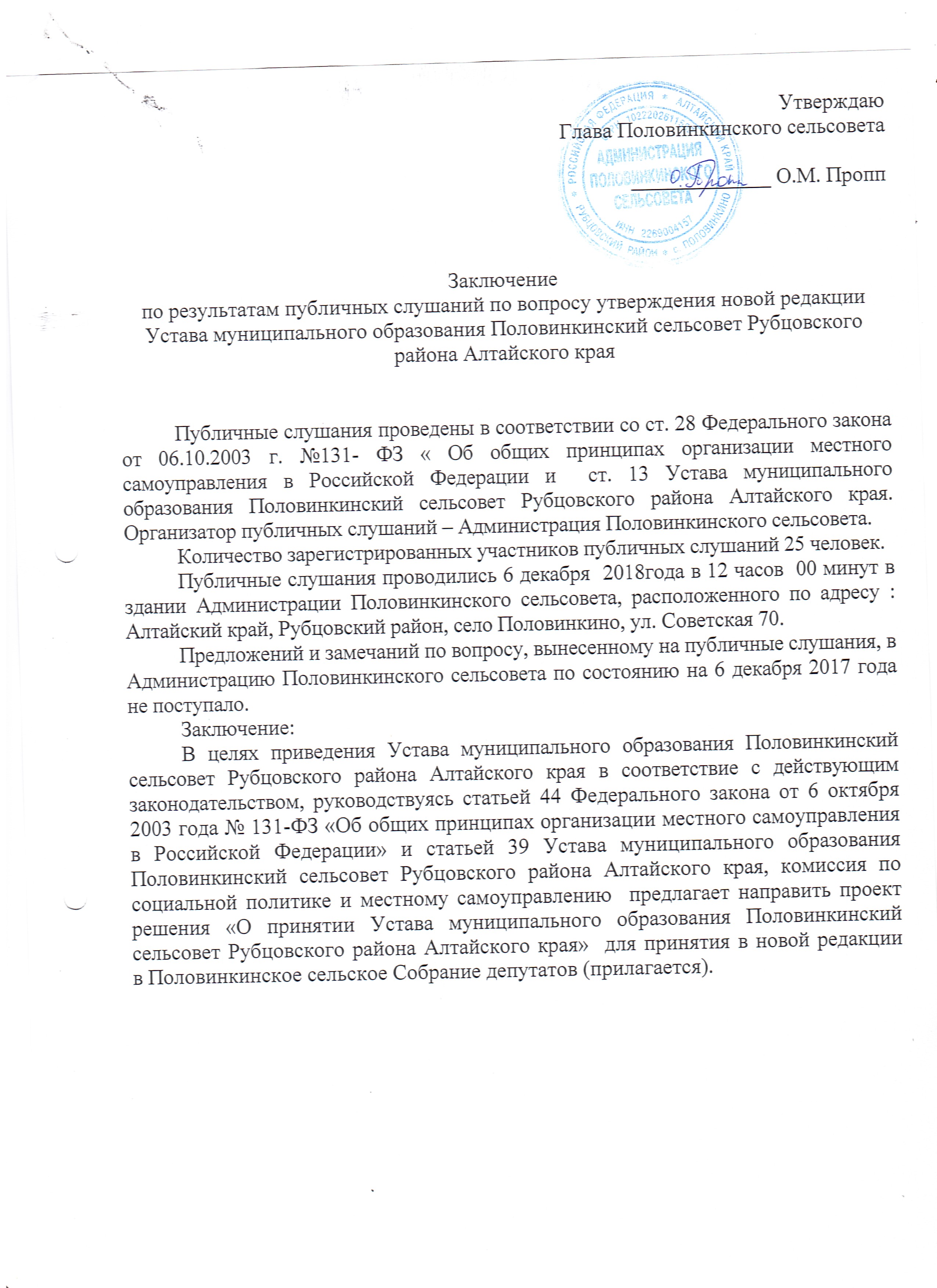 Заключение по результатам публичных слушаний по вопросу утверждения новой редакции Устава муниципального образования Половинкинский сельсовет Рубцовского района Алтайского края
