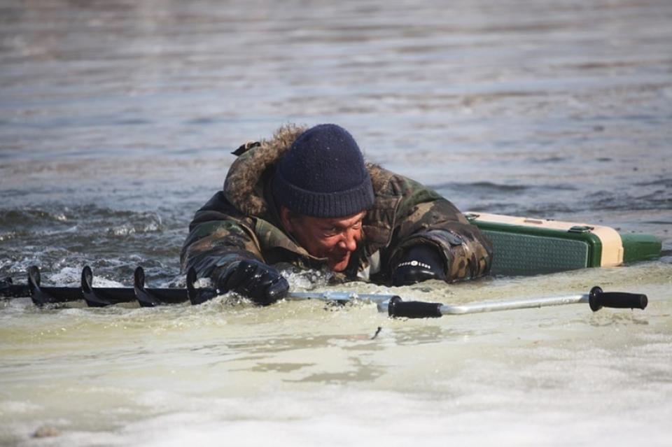 После выхода из воды на лед нужно двигаться к берегу ползком или перекатываясь в том же направлении, откуда вы пришли. Вставать и бежать нельзя, поскольку можно снова провалиться.