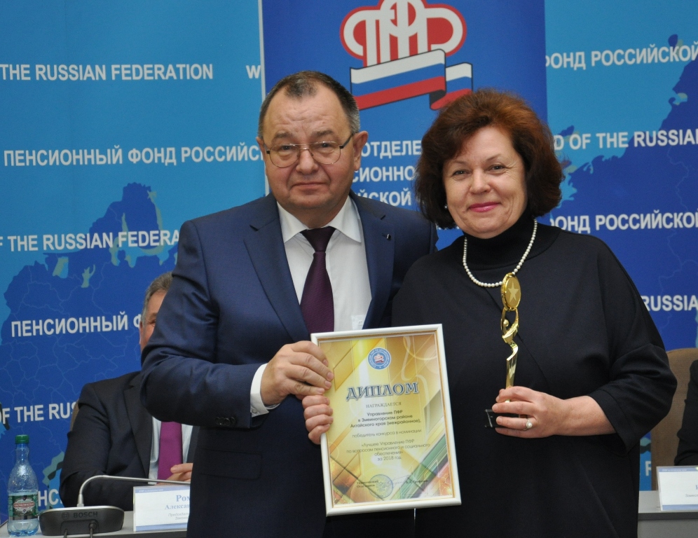 - «Лучшее Управление ПФР Пенсионного фонда Российской Федерации в Алтайском крае за 2018 год» - Управление ПФР в Змеиногорском районе (межрайонное), начальник Управления Ольга Николаевна Соковнина.