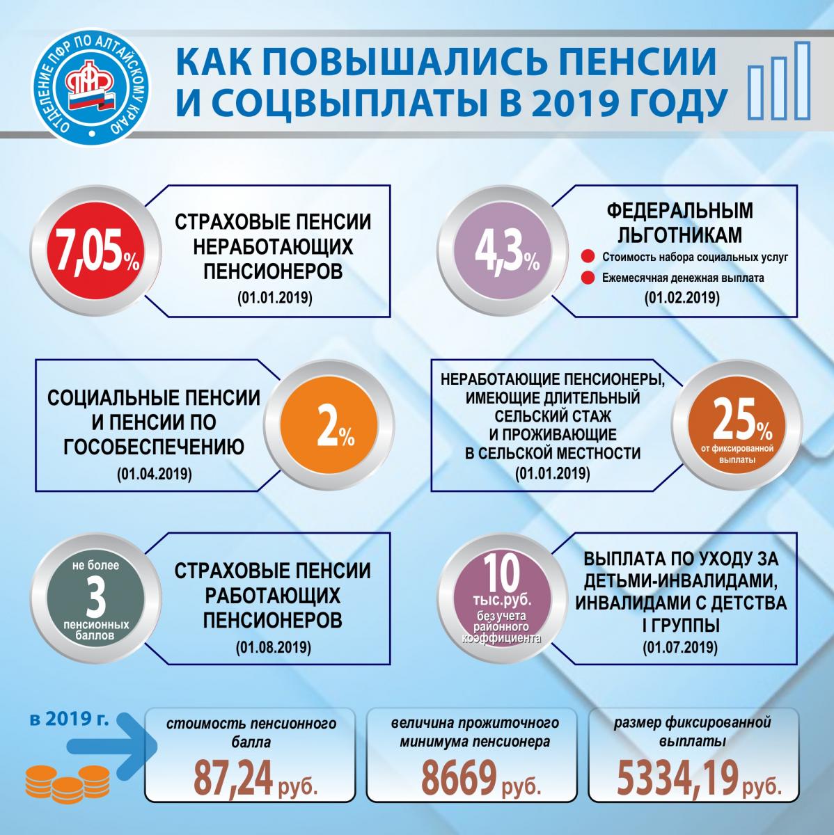 С 1 июля 2019 согласно указу Президента РФ повысилась ежемесячная выплата по уходу за детьми-инвалидами и инвалидами с детства I группы с 5500 рублей до 10 000 рублей. В Алтайском крае размер этой выплаты составил 11 500 руб. (с учетом районного коэффициента 15%) и 12 000 руб. (с учетом районного коэффициента 20%).С 1 августа традиционно был произведен ежегодный перерасчет пенсий для работающих пенсионеров, который производится согласно данным предоставленным работодателями. Увеличение пенсии, и это установлено законодательством, не превышает 3-х пенсионных баллов. Стоимость одного пенсионного балла определяется по году назначения пенсии: в 2018 году она была 81,49 руб., в 2019 году – 87, 24 руб.