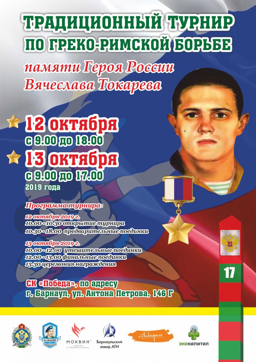 12 и 13 октября 2019 г. во дворце спорта «Победа» (г.Барнаул, ул.Антона Петрова 146 «Г») Пограничным управлением ФСБ России по Алтайскому краю при поддержке фонда Героя России В.А. Шаманова «Защитники Отечества» и участии ООО «Моквин», Барнаульского завода АТИ, компании «ЭкоКапитал» и рекламно-производственной компании «Акварель» будет проводиться «XII Традиционный турнир по греко-римской борьбе среди молодежи», посвященный памяти Героя России Токарева В.В.