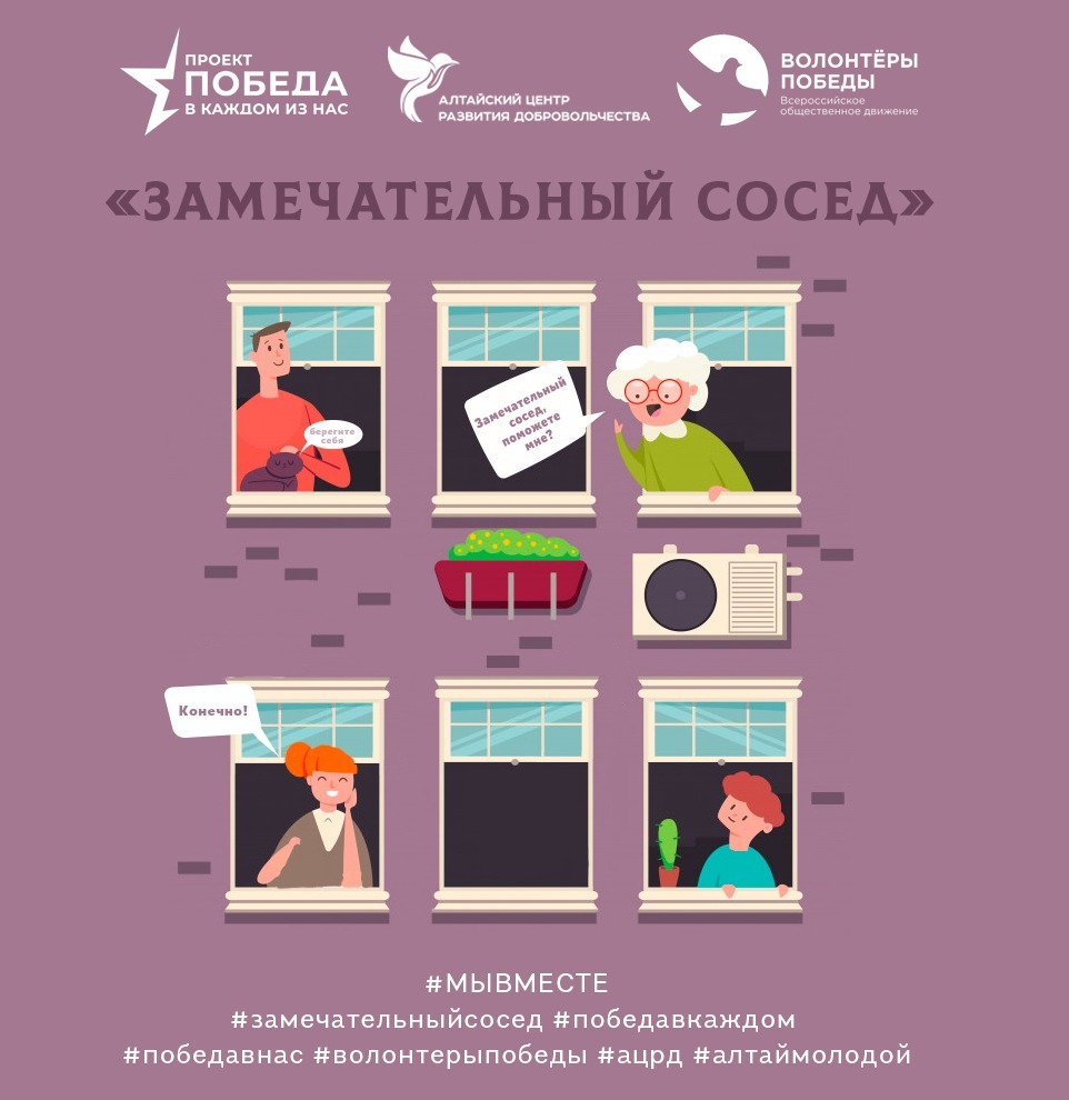 Проект «Победа в каждом из нас», Алтайское региональное отделение «Волонтеры Победы» и Алтайский центр развития добровольчества, в столь непростое время, предлагают соседям проявить заботу и ответственность по отношению друг к другу. Пожалуй, сейчас, как никогда, нам всем нужна поддержка, в том числе и соседская. Присоединяясь к акции «Замечательный сосед», каждый сможет подарить частичку тепла и доброты тем, кто живет рядом. К тому же, своей добрососедской поддержкой, вы можете стать помощником всероссийской акции взаимопомощи во время пандемии коронавируса #МЫВМЕСТЕ.
