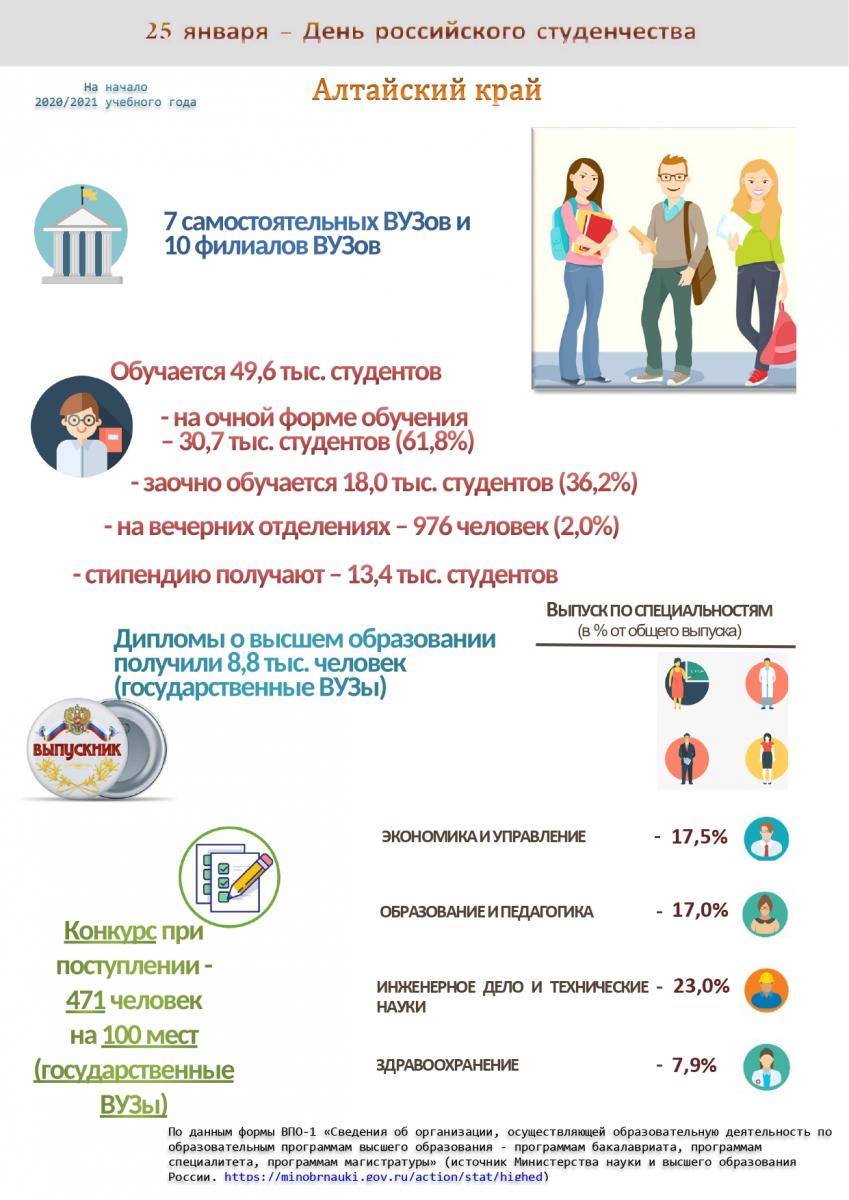В Алтайском крае в 2021 году этот день будет праздничным для 49,6 тыс. студентов высших учебных заведений (ВУЗ). На очных отделениях ВУЗов в 2020 году обучались 30,7 тыс. студентов или 61,8% от общего количества студентов, заочных – 18,0 тыс. студентов или 36,2%, очно-заочных (вечерних) – 1,0 тыс. студентов или 2,0%.