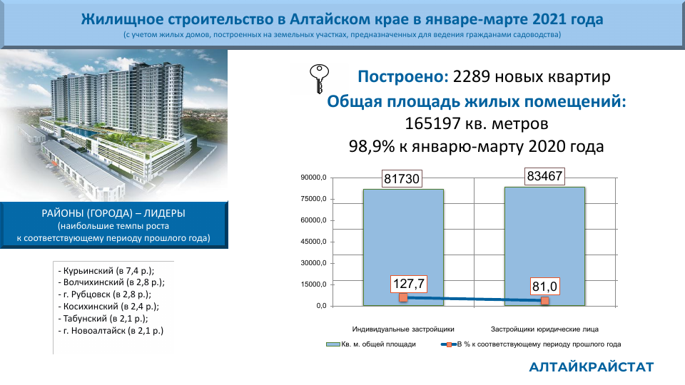 В январе-марте 2021 года на территории края предприятиями, организациями и индивидуальными застройщиками построено 2289 новых квартир общей площадью 165,2 тыс. кв. метров, что на 1,1% меньше января-марта 2020 года.