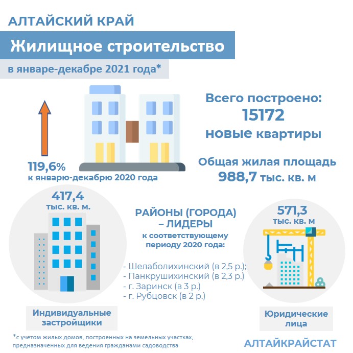 За 2021 год на территории края предприятиями, организациями и индивидуальными застройщиками построены 15172 новые квартиры общей площадью 988,7 тыс. кв. метров, что на 19,6% больше 2020 года.
