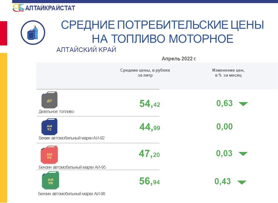 Средние потребительские цены на бензин автомобильный и дизельное топливо по городам Алтайского края за апрель 2022 года составили: