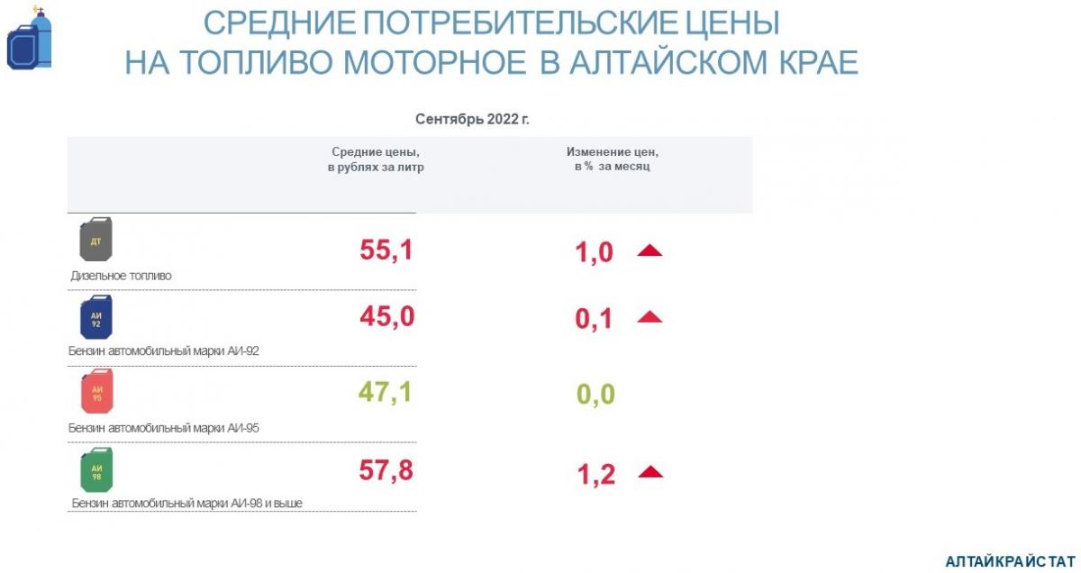 Средние потребительские цены на бензин автомобильный и дизельное топливо по городам Алтайского края за сентябрь 2022 года составили: