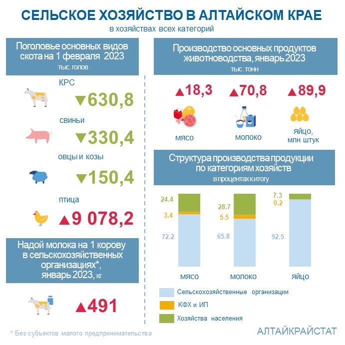 В январе 2023 года в хозяйствах всех категорий, по расчётам, произведено 18,3 тыс. тонн скота и птицы на убой (в живом весе), 70,8 тыс. тонн молока, 89,9 млн штук яиц.