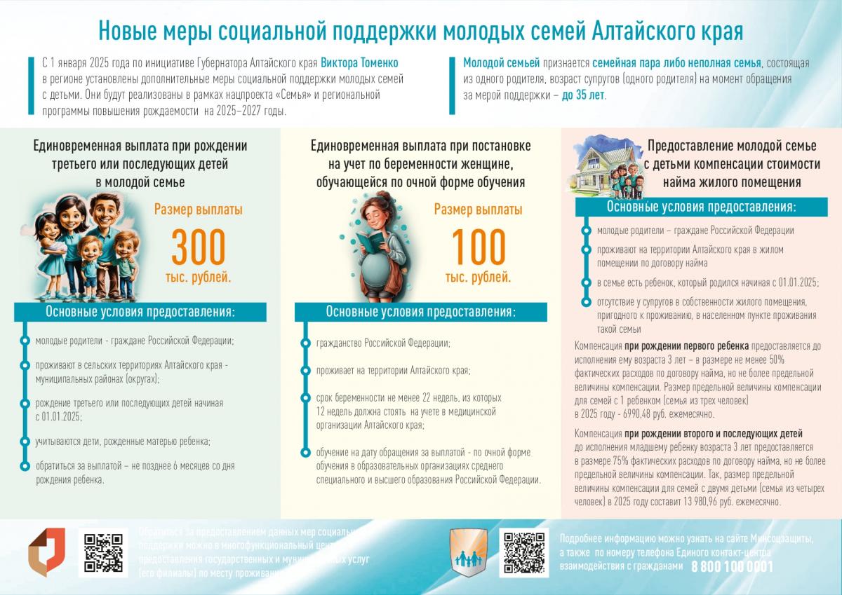 С января 2025 года по инициативе Губернатора Алтайского края Виктора Томенко в регионе установлены дополнительные меры социальной поддержки молодых семей с детьми. Это единовременная выплата при рождении третьего или последующих детей в молодой семье; единовременная выплата при постановке на учет по беременности женщине, обучающейся по очной форме обучения; компенсация стоимости найма жилого помещения.