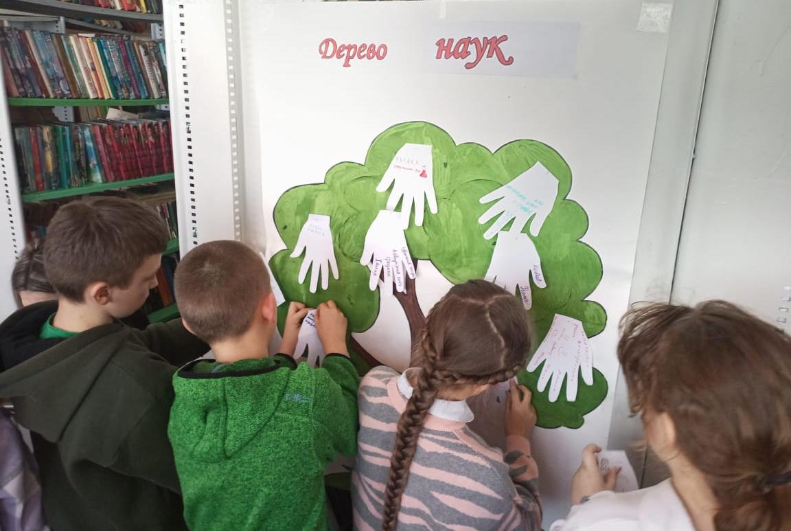 В завершении мероприятия участники написали на вырезанных из бумаги ладошках названия всех наук, с которыми они познакомились, и прикрепили их на «Дерево наук».