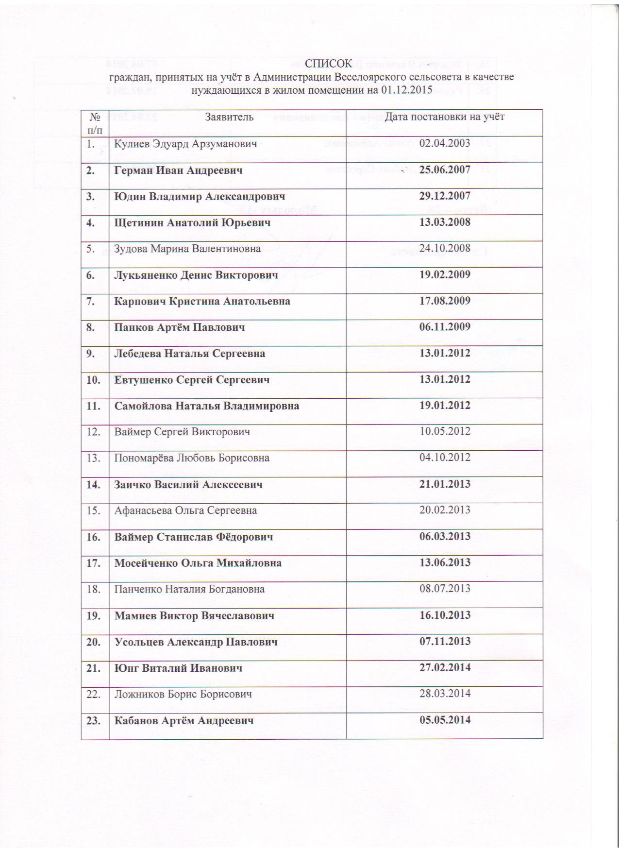 Список граждан, принятых на учёт в Администрации Веселорского сельсовета в качестве нуждающихся в жилом помещении на 01.12.2015