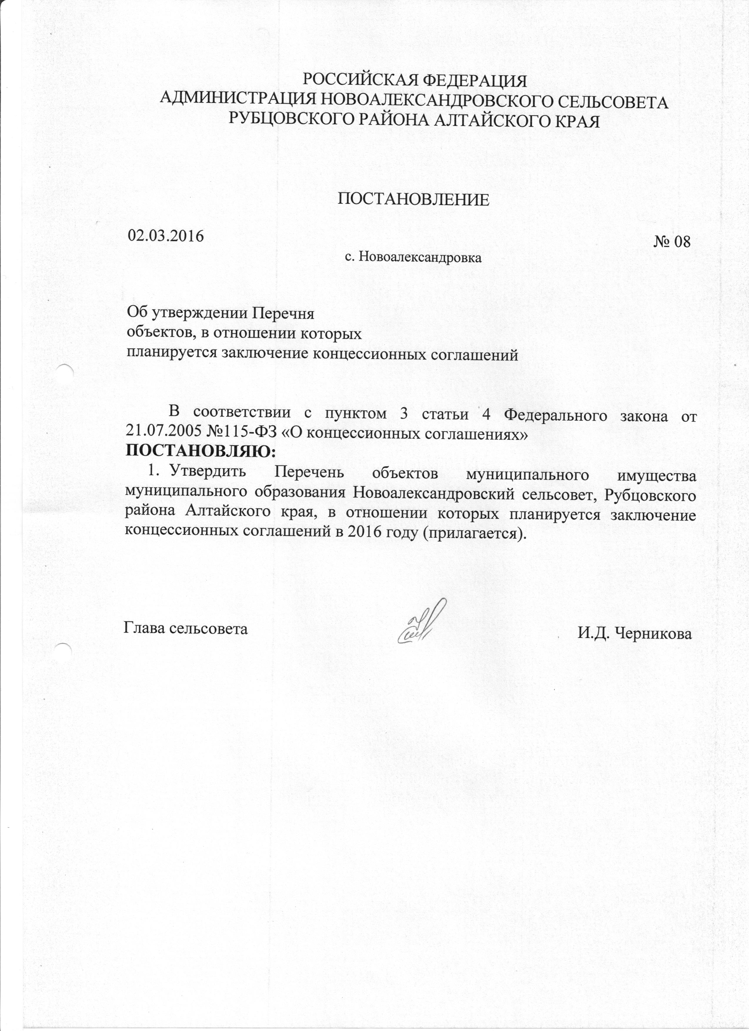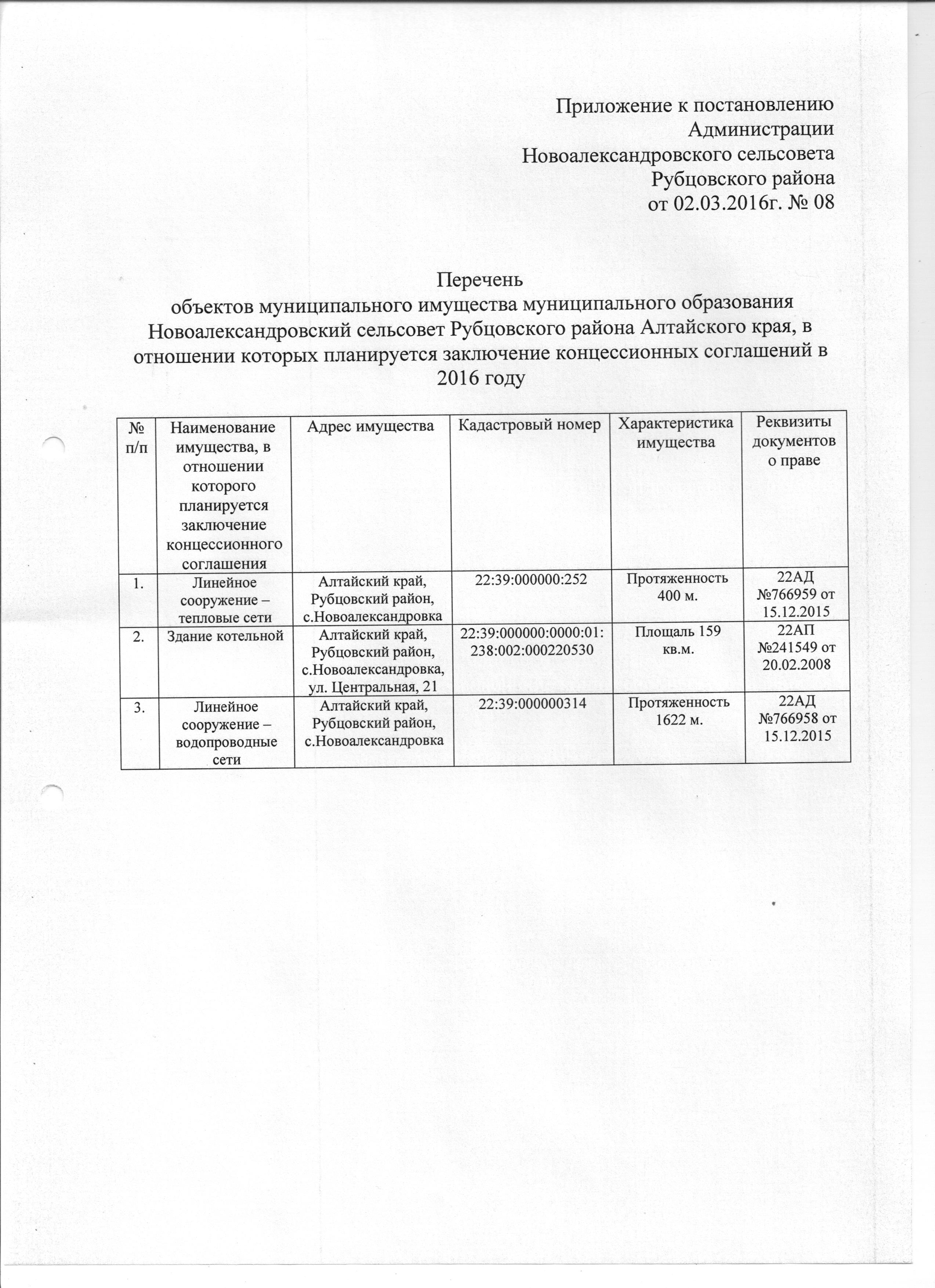 Постановление № 08 от 02.03.2016г. "Об утверждении Перечня объектов, в отношении которых планируется заключение концессионных соглашений".