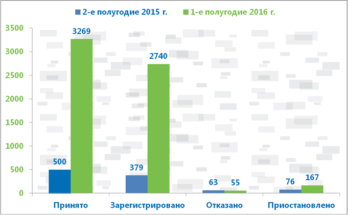![]() Кроме того, по сравнению с 2-м полугодием 2015 года уменьшилось количество отказов в проведении регистрации.
