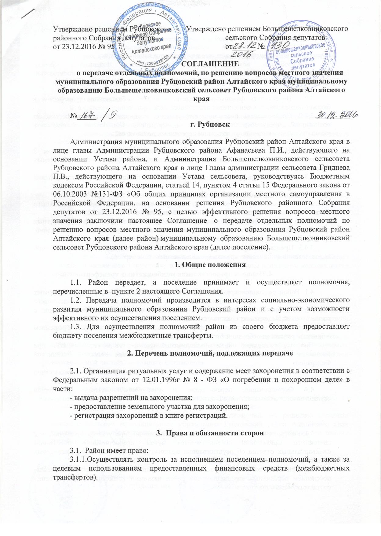 Решение № 129 от 28.12.2016 "О внесении изменений и дополнений в решение от 28.12.2015 № 107 "Об утверждении бюджета муниципального образования Большешелковниковский сельсовет Рубцовского района Алтайского края на 2016 год" Решение № 130 от 28.12.2016 "Об утверждении соглашений о передачи отдельных полномочий по решению вопросов местного значения муниципального образования Рубцовский район Алтайского края муниципальному образованию Большешелковниковский сельсовет Рубцовского района Алтайского края" Решение № 131 от 28.12.2016 "Об утверждении бюджета муниципального образования Большешелковниковский сельсовет Рубцовского района Алтайского края на 2017 год" Решение № 132 от 28.12.2016 "Об условиях выдвижения кандидатов в избирательную комиссию муниципального образования Большешелковниковский сельсовет Рубцовского района Алтайского края" Решение № 133 от 28.12.2016 "Об утверждении перспективного плана работы Большешелковниковского сельского Собрания депутатов на 2017 год"